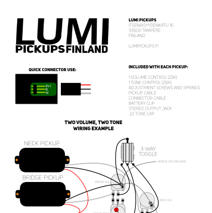 What are active pickups and how do they work? Passive pickups work when the vibrating metal strings above them generate a moving magnetic field and a small amount of electric current is induced in the coils. Compared to passive pickups, active pickups come with an internal preamplifier that will alter the signal coming from the coils. It compares the signal coming out of the coils to the signal it gets from the power source (battery), and then internally amplifies the pickups signal to the desired output level. By utilizing the preamplifier you gain more output and headroom, and lower the impedance of the guitars output. Lower pickup impedance in turn will interact with your amplifier, so that you retain more high end than is possible with passive pickups.With Lumi Pickups you gain two sides of both worlds, handwound coils that give you that creamy thick harmonic content that is created by the slight variations on the winding of the coil wire, and a preamplifier circuit created with the latest technology components. High headroom, dynamic responsive pick attack, thick midrange and smooth top end. Extended highs and lows.We use alnico 5 magnets in our pickups for thicker midrange and the smooth top end they produce. Our high quality coil wire is made in the UK.